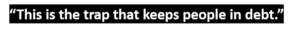 The same is true of your money. The financial weeds are anything that stops you from first, getting out of debt, and second, saving money. The weeds are easy to see but hard to stop. These are the things we spend money on that we never intended. When making a budget, you should prioritize your spending and predetermine your wants from your needs. Label each of your expenses and assign a dollar figure, like this: Needs vs. Wants. If you are about to spend money on anything that does not appear in one of these columns, then you’re in the weeds. If you are about to overspend on a budgeted item, you’re in the weeds. The point of this is not whether you should spend the money or not; only you can make that choice. There are, however, unintended consequences to any additional spending choices you make. If you have overspent, you will need to make more money, cut back on something else, or add debt to cover the additional spending. Adding debt is the usual choice because it is perceived to be less painful. This choice is the trap that keeps people in debt.